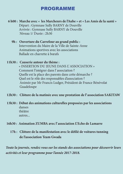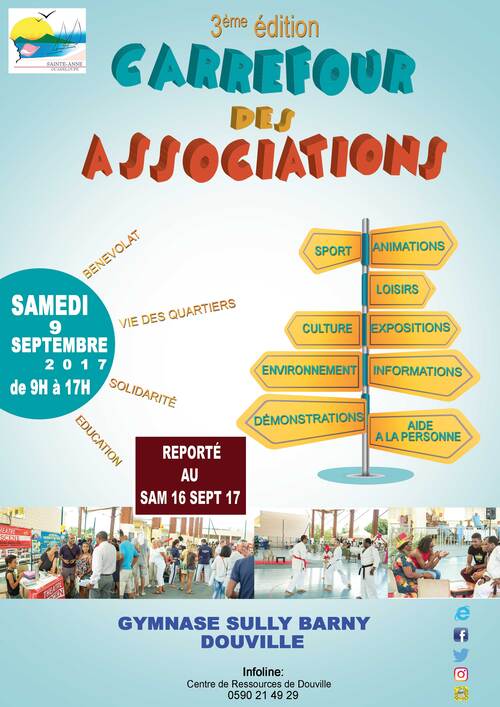 Initialement prévue le samedi 9 sept 2017, la Ville de Sainte-Anne organisera finalement la 3ème édition du "Carrefour des Associations", le Samedi 16 septembre 2017, de 9h00 à 17h00 au Gymnase Sully Barny de Douville.