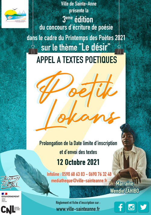 Pour permettre à un plus grand nombre de participants de s’inscrire à la 3ème édition du concours de poésie en créole #PoetikLokans, la Ville de Sainte-Anne vous informe que la période d’inscription et d’envoi des textes est prolongée jusqu’au 12 octobre 2021.