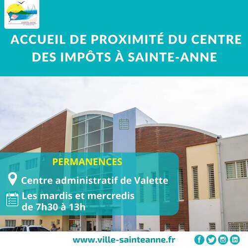 Janvier 2022La Ville de Sainte-Anne Guadeloupe vous informe que les agents de l’accueil de proximité du Centre des Impôts assureront deux permanences par semaine au Centre Administratif de Valette, aux jours et horaires suivants :