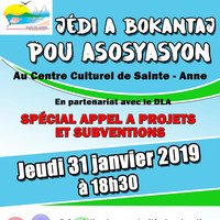Il invite tous les responsables associatifs intéressés, à participer au JEDI A BOKANTAJ POU ASOSYASON » spécial « appel à projets et subventions, qui sera organisé le jeudi 31 janvier 2019 à 18h30 au Centre Culturel de Sainte-Anne.