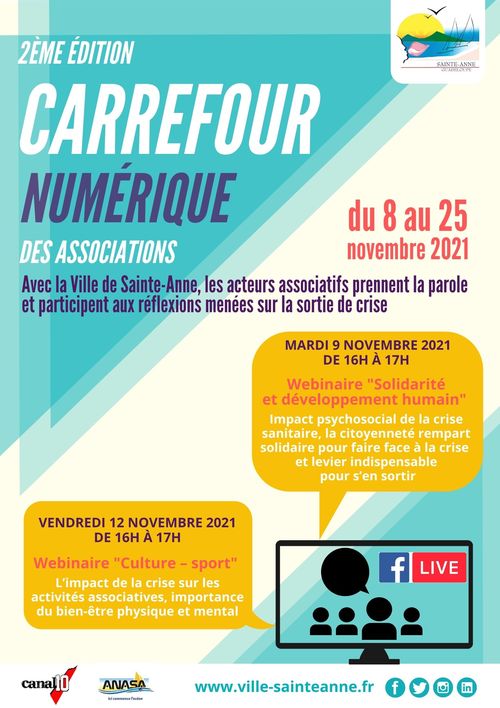De plus, pour soutenir le tissu associatif durement éprouvé par la crise sanitaire, sociale et économique, il s’agit pour la municipalité d’ accompagner plus que jamais les associations locales dans la relance de leurs activités. Dès lors, pour éviter les rassemblements et tout risque de propagation du virus, les Saintannais et les Saintannaises sont invités à découvrir les activités proposées par les associations du territoire à travers une vitrine numérique éphémère (Page événement Facebook : Carrefour Numériques des Associations 2021 de la Ville de Sainte-Anne).