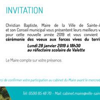Christian BAPTISTE, maire de la ville de Sainte-Anne, et son Conseil municipal invitent les forces vives du territoire (associations, acteurs économiques et corps constitués) à la cérémonie des vœux qui se tiendra le lundi 28 janvier à 18h30 au réfectoire scolaire de Valette.