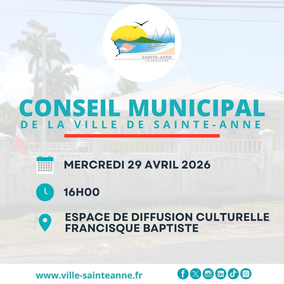 📣 La Ville de Sainte-Anne vous informe de la tenue de son prochain 𝐂𝐨𝐧𝐬𝐞𝐢𝐥 𝐦𝐮𝐧𝐢𝐜𝐢𝐩𝐚𝐥 𝐥𝐞 mercredi 29 avril à 16h 𝐚̀ 𝐥’𝐞𝐬𝐩𝐚𝐜𝐞 𝐝𝐞 𝐝𝐢𝐟𝐟𝐮𝐬𝐢𝐨𝐧 𝐜𝐮𝐥𝐭𝐮𝐫𝐞𝐥𝐥𝐞 𝐅𝐫𝐚𝐧𝐜𝐢𝐬𝐪𝐮𝐞 𝐁𝐚𝐩𝐭𝐢𝐬𝐭𝐞, situé au 30 rue Paulin Chipotel, à Montmain.
