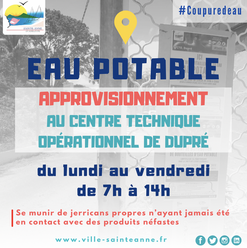 En attendant un retour à la normale, il informe la population qu’il est possible de s’approvisionner en eau potable au Centre Technique Opérationnel (CTO) situé au 3, Point des Galbas à Sainte-Anne (en face de l’Office du Tourisme, non loin du rond-point Nèg Mawon), du lundi au vendredi de 7h à 14h.