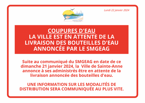 Janvier 2024Suite au communiqué du SMGEAG en date de ce dimanche 21 janvier 2024, la Ville de Sainte-Anne annonce à ses administrés être en attente de la livraison annoncée des bouteilles d’eau.