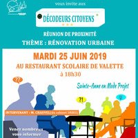 Christian Baptiste, maire de la ville de Sainte-Anne, organise une réunion publique le Mardi 25 juin 2019 à 18h30 au restaurant scolaire de Valette, à propos de la rénovation urbaine, en présence du cabinet URBIS.