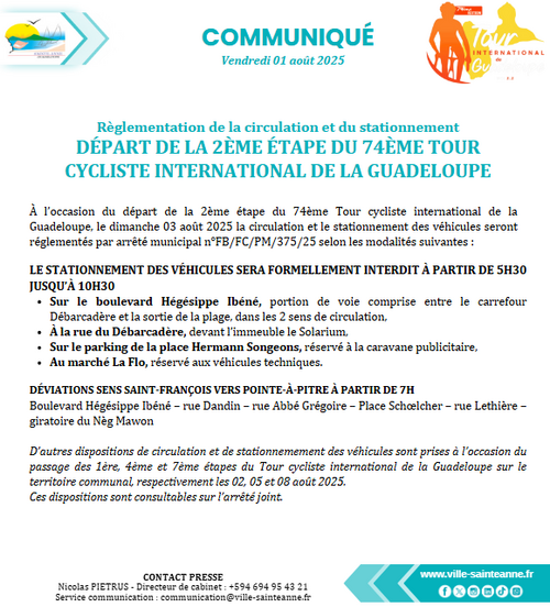 D’autres dispositions de circulation et de stationnemement des véhicules sont prises à l’occasion du passage des 1ère, 4ème et 7ème étapes du Tour cycliste international de la Guadeloupe sur le territoire communal, respectivement les 02, 05 et 08 août 2025.