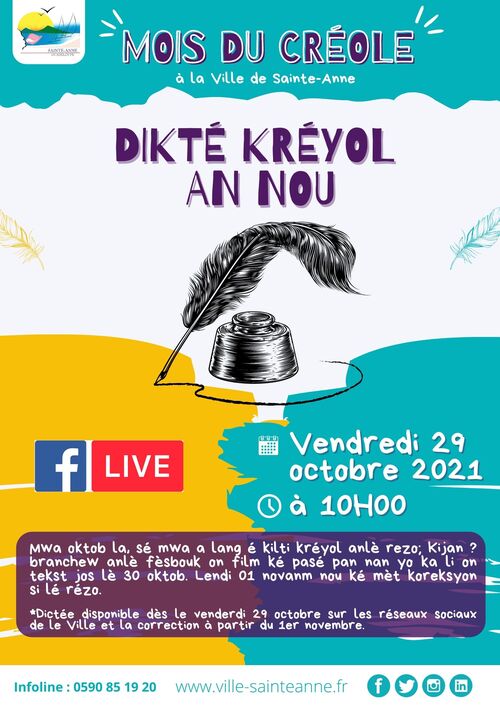 Dans le cadre du mois du créole, la Ville de Sainte-Anne organise une "Dikté Kréyol" le vendredi 29 octobre 202, à 10h, à suivre en Facebook live avec avec la participation de Didyer Mannette.