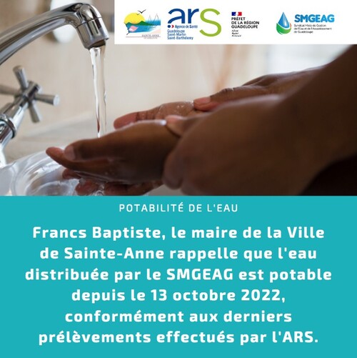 Francs Baptiste, le maire de la Ville de Sainte-Anne rappelle que l’eau distribuée par le SMGEAG est potable depuis le 13 octobre 2022, conformément aux derniers prélèvements effectués par l’ARS.