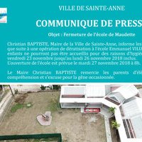 Christian BAPTISTE, Maire de la Ville de Sainte-Anne, informe les parents d’élèves que suite à une opération de dératisation à l’école Emmanuel VILUS à Maudette, les enfants ne pourront pas être accueillis pour des raisons d’hygiène à compter du vendredi 23 novembre jusqu’au lundi 26 novembre 2018 inclus.