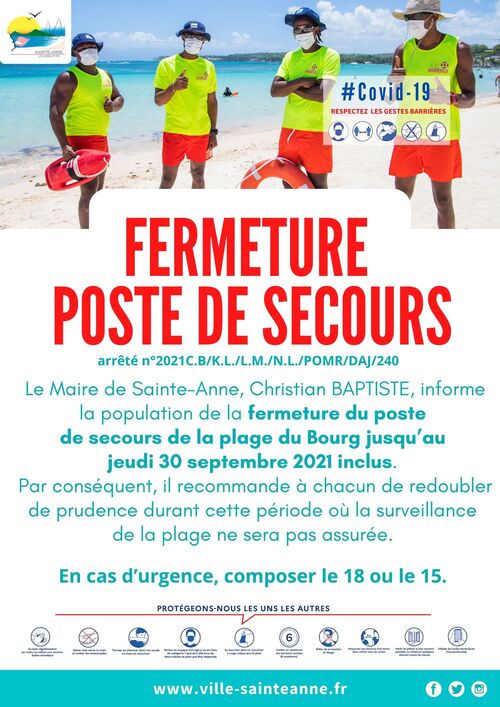 Le Maire de Sainte-Anne, Christian BAPTISTE, informe la population de la fermeture du poste de secours de la plage du Bourg jusqu’au jeudi 30 septembre 2021 inclus.