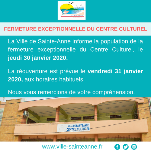 Janvier 2020La ville de Sainte-Anne vous informe que le Centre culturel sera exceptionnellement fermé ce jeudi 30 janvier. Sa réouverture est prévue le vendredi 31 janvier aux horaires habituels.