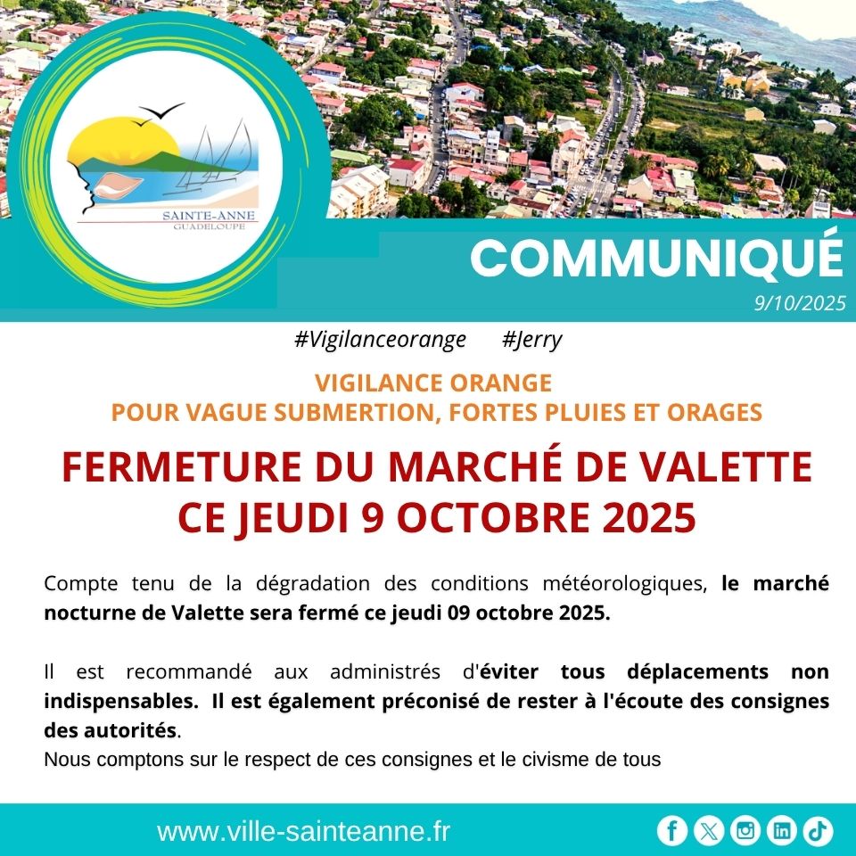 Compte tenu de la dégradation des conditions météorologiques annoncée pour les prochaines heures, le Maire Francs BAPTISTE informe la population que le marché de Valette sera fermé ce jeudi 9 octobre 2025.