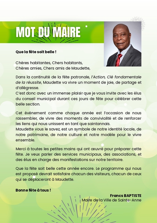 Chères amies, Chers amis de Maudette,Dans la continuité de la fête patronale, l’Action, Clé fondamentale de la réussite, Maudette va vivre un moment de joie, de partage et d’allégresse.
