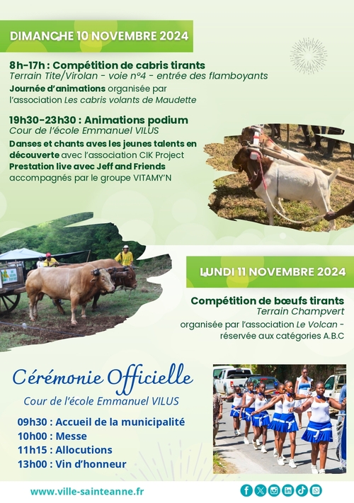 – des compétitions de bœufs tirants, organisée par l’association Le volcan de Sainte-Anne, et de cabris tirants, organisée par l’association Les cabris volants de Maudette,