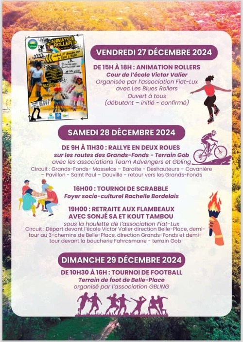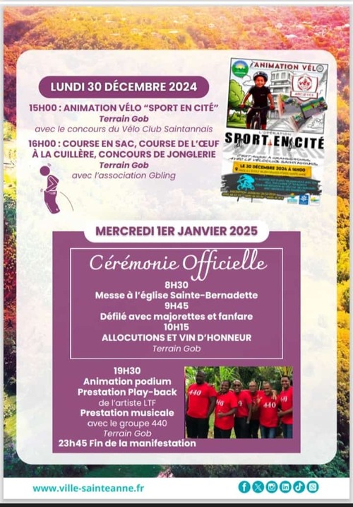 La Ville de Sainte-Anne et les associations du territoire ont le plaisir de vous inviter à la Fête des Grands-Fonds qui se tiendra 27 décembre 2024 au 1er janvier 2025.