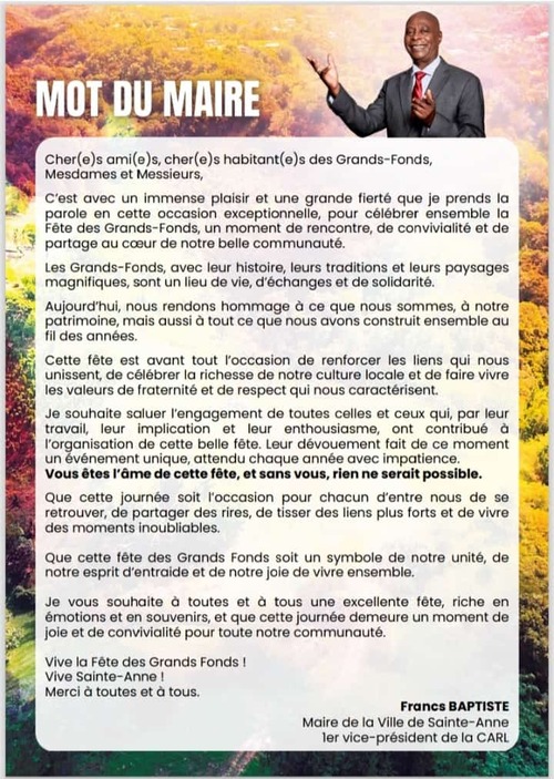 Que cette fête des Grands Fonds soit un symbole de notre unité, de notre esprit d’entraide et de notre joie de vivre ensemble.
