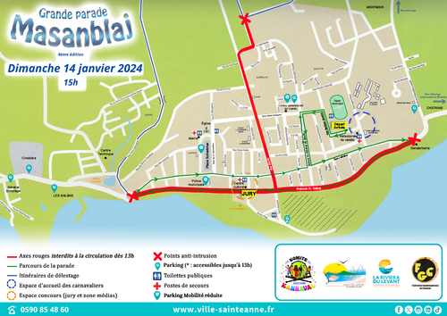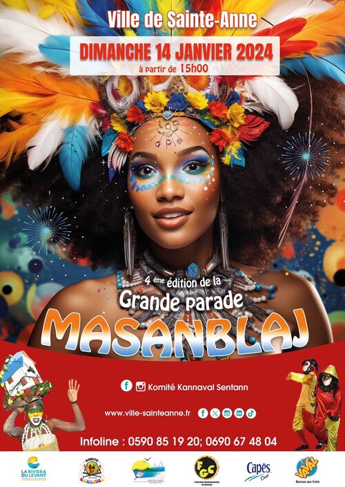 Le Komité Kannaval Sentann vous donne rdv ce dimanche 14 janvier 2024 pour vibrer aux rythmes du carnaval 2024 dans les rues de Sainte-Anne ! Venez assister à la 4ème édition de la Grande Parade Masanblaj à partir de 15 heures.