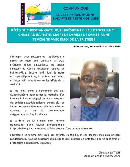 Octobre 2020Suite au décès de Christian GATOUX, Président d’Eau d’Excellence depuis le mois d’août dernier, le Maire de la Ville de Sainte-Anne tient à saluer l’engagement de son ami et homme politique dans la vie publique locale. Il adresse aussi ses plus vives condoléances à sa famille.