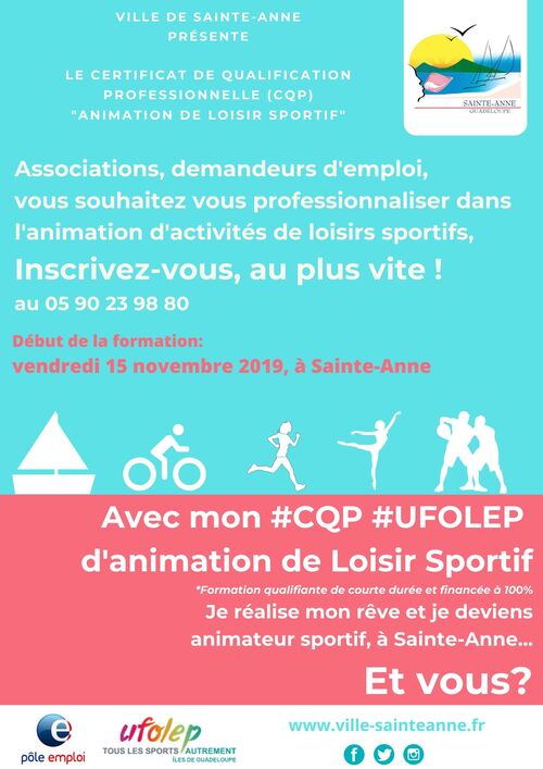Dans le cadre des actions d’insertion, la ville de Sainte-Anne organise en partenariat avec le Pôle emploi et l’UFOLEP des îles de Guadeloupe, une session de formation CQP ALS (Certificat de Qualification Professionnelle Animation de Loisir Sportif) qui démarre le vendredi 15 novembre 2019.