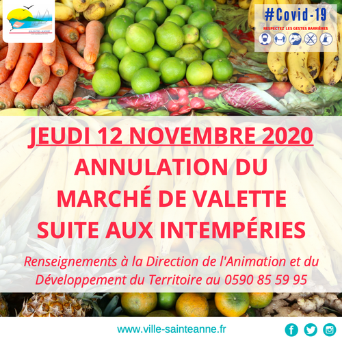 Novembre 2020La Ville de Sainte-Anne informe la population que suite aux intempéries de ces derniers jours, le Marché de Valette est annulé ce jeudi 12 novembre 2020.