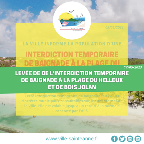 La Ville de Sainte-Anne informe la population qu’une interdiction de baignade est en cours, aux plages du Helleux et de Bois Jolan, suite aux résultats non conformes de la qualité des eaux de baignade communiqués ce jeudi 4 mai 2023 par l’ARS.