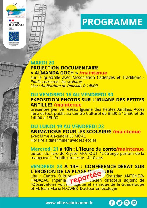- Vendredi 23 septembre à 19h, au Centre Culturel : Conférence-débat sur le thème de l’Erosion de la plage du bourg - Intervenant : Christian ANTENOR-HABAZAC, Ingénieur C.N.R.S, ancien directeur adjoint de l’Observatoire volcanologique et sismique de la Guadeloupe et M. Jean-Marie FLOWER, Docteur en écologie