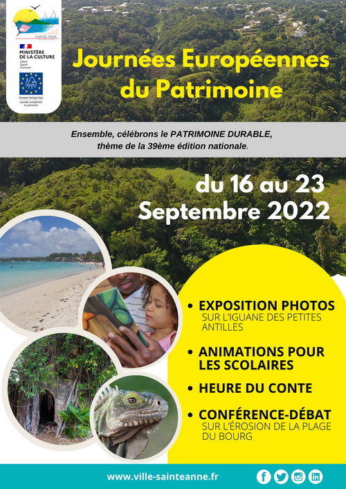 Autant d’enjeux qui seront mis en lumière par les #JEP2022. Ainsi, du 16 au 23 septembre 2022, la Ville de Sainte-Anne vous propose de découvrir ou (re)découvrir son patrimoine matériel et immatériel à travers un riche programme : projection documentaire, exposition, animations pour les scolaires et une conférence-débat.