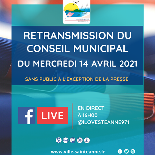 Avril 2021Ce mercredi 14 avril 2021, à 16 heures en salle des délibérations de la mairie, les conseillers municipaux se réuniront à l’occasion de la 2ème session ordinaire du Conseil Municipal de la Ville de Sainte-Anne. Compte-tenu du contexte sanitaire, cette session se déroulera sans public à l’exception de la presse.