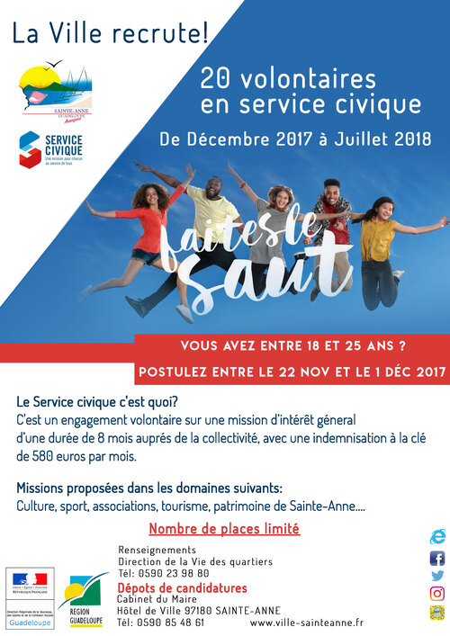 Dans le cadre de son développement d’une politique ambitieuse en direction de la jeunesse et du service civique, la Ville de Sainte-Anne recherche 20 jeunes volontaires âgés de 18 à 25 ans motivés et intéressés notamment par la culture, le sport, les métiers de l’accueil et du tourisme et ayant un bon niveau en anglais et en espagnol.