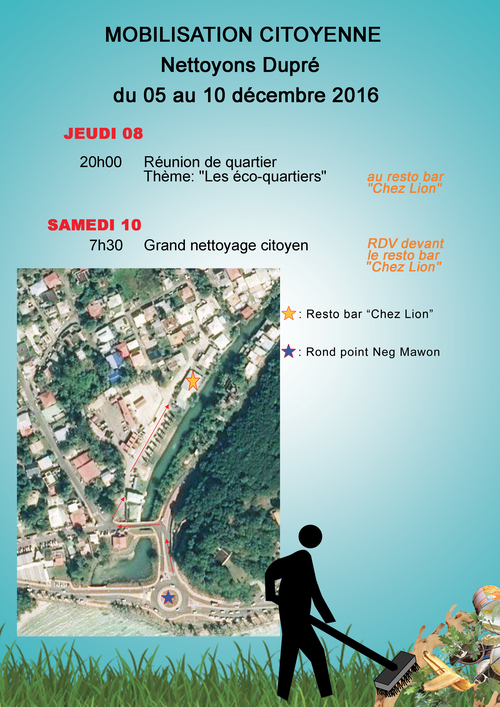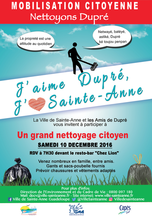Dans le cadre de la 2ème mobilisation citoyenne "J’aime mon quartier, J’aime Sainte-Anne" à Dupré, Christian Baptiste invitent les résidents de ce quartier à participer au Grand Nettoyage Citoyen le samedi 10 décembre à 7H30.