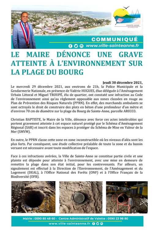 Décembre 2021Le Maire de la Ville de Sainte-Anne dénonce une grave atteinte à l’environnement sur la plage du Bourg.