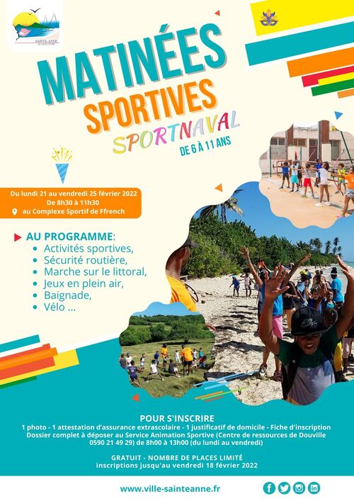 Dans le cadre de sa politique sportive, la Ville de Sainte-Anne invite les enfants du territoire âgés de 6 à 11 ans, à participer aux matinées sportives qui auront lieu du lundi 22 au vendredi 25 février 2022, de 8h30 à 11h30, au complexe sportif de Ffrench.
