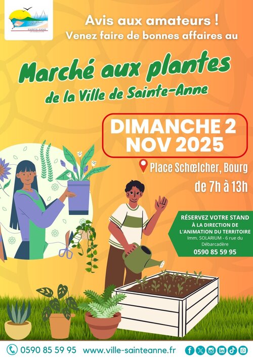 – Le marché aux plantes de la Ville de Sainte-Anne a lieu le 1er dimanche de chaque mois de 7h à 13h, sur réservation.