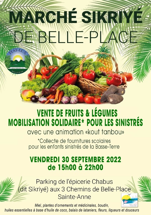 La Ville de Sainte-Anne vous invite au 𝐌𝐚𝐫𝐜𝐡𝐞́ 𝐒𝐢𝐤𝐫𝐲𝐞́ 𝐝𝐞 𝐁𝐞𝐥𝐥𝐞 𝐏𝐥𝐚𝐜𝐞 qui aura lieu le vendredi 30 septembre 2022 de 19h00 à 22h00 sur le parking de l’épicerie CHABUS aux 3 chemins de Belle-Place.