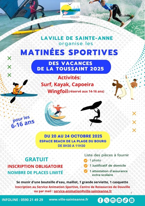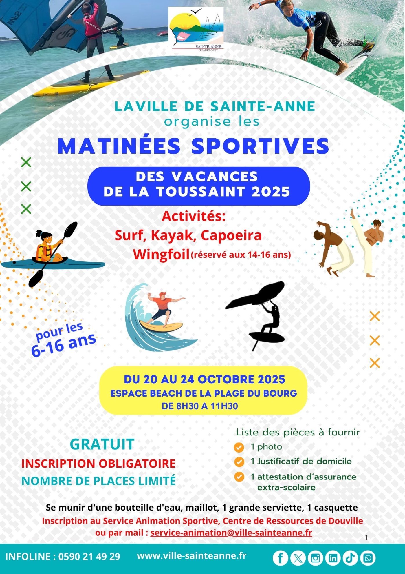 Dans le cadre de sa saison d’animation sportive 2025, la Ville de Sainte-Anne 🏝️ invite les enfants du territoire âgés 𝗱𝗲 𝟲 𝗮̀ 𝟭𝟲 𝗮𝗻𝘀 👦🏾👧🏾 à participer aux 𝗺𝗮𝘁𝗶𝗻𝗲́𝗲𝘀 𝘀𝗽𝗼𝗿𝘁𝗶𝘃𝗲𝘀 qui auront lieu 𝗱𝘂 𝗹𝘂𝗻𝗱𝗶 𝟐𝟎 𝗮𝘂 𝘃𝗲𝗻𝗱𝗿𝗲𝗱𝗶 𝟐𝟒 𝐨𝐜𝐭𝐨𝐛𝐫𝐞 𝟮𝟬𝟮𝟓, 𝗱𝗲 𝟴𝗵 𝗮̀ 𝟭𝟭𝗵𝟯𝟬 sur l’Espace Beach 🏖️ de la Plage du Bourg.