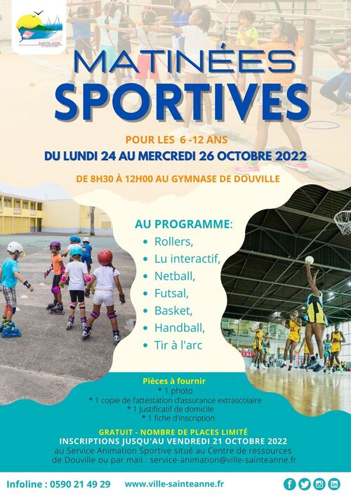 – au Service Animation Sportive (Centre de ressources de Douville - 0590 21 49 29) de 7h30 à 12h30 (du lundi au vendredi) et de 14h à 17h (lundi, mardi et jeudi)
