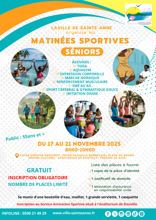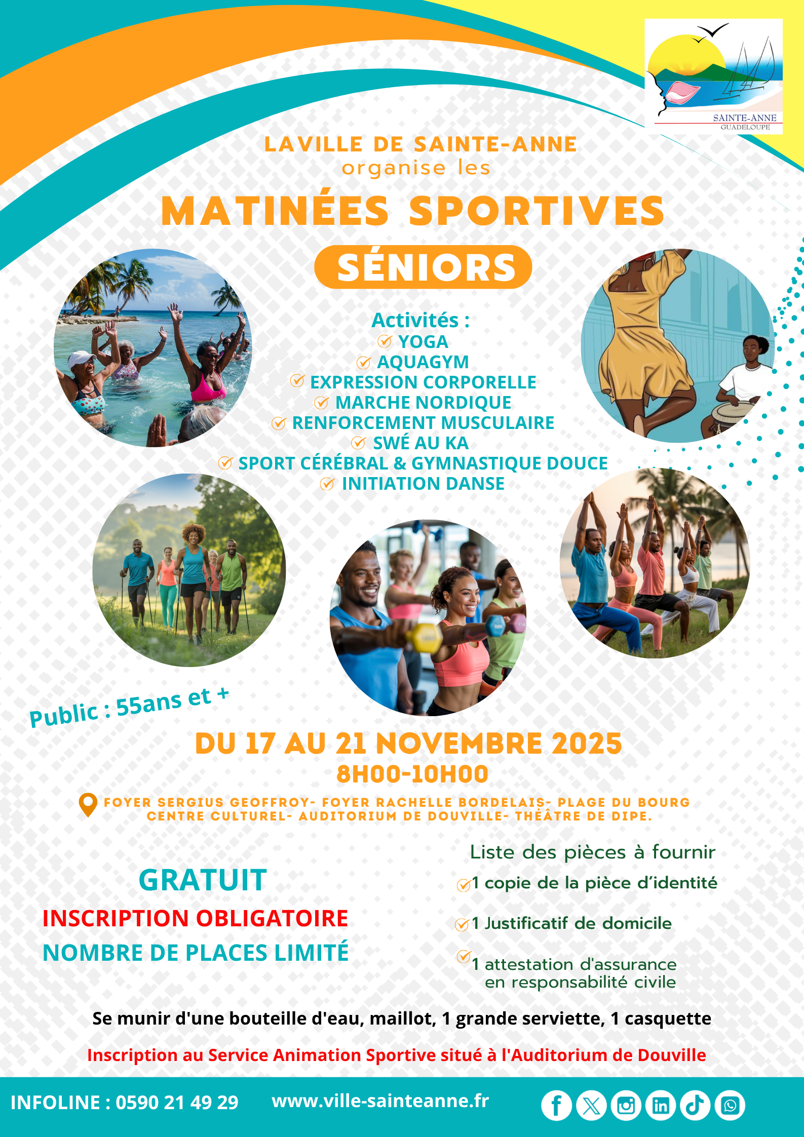 Du 17 au 21 novembre 2025, la Ville de Sainte-Anne vous invite à ses Matinées Sportives Séniors : Yoga, aquagym, marche nordique, renforcement musculaire, swé au ka, gym douce, danse… 🎶