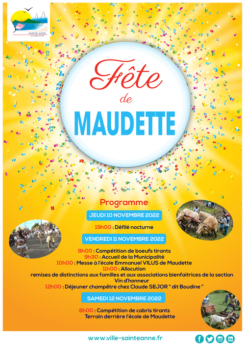 Maudette en Fête : Ville de Sainte-Anne Guadeloupe vous invite à participer du 10 au 12 novembre, aux 3 jours d’animations organisés autour de la cérémonie officielle du quartier de Maudette.