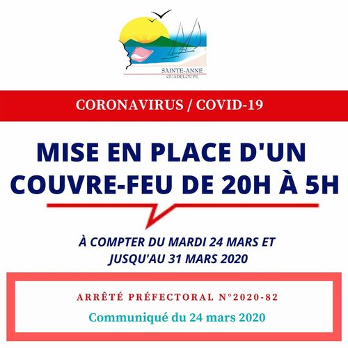 Pour prévenir tout risque de propagation du coronavirus COVID-19, la Ville de Sainte-Anne a souhaité renforcer les mesures de confinement. Suite à l’arrêté préfectoral n°2020-82 pris ce mardi 24 mars 2020, Christian baptiste, le Maire de la Ville de Sainte-Anne informe la population de la mise en place d’un couvre-feu à compter du mardi 24 mars et ce jusqu’au 31 mars 2020 inclus, entre 20h à 5h du matin.