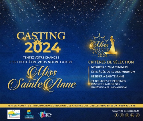 Tu es une jeune femme pétillante avec un bel état d’esprit ? Tu veux apporter du rêve et du bonheur autour de toi ? Tu connais ton territoire et sa culture ? Alors n’hésite plus, tente l’aventure Miss Sainte-Anne 2024 et deviens l’ambassadrice de ta Ville !