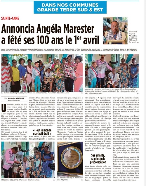 Avril 2022La Ville de Sainte-Anne s’est enrichie d’un nouveau centenaire.