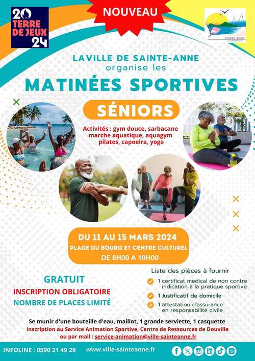 Si vous avez + de 50 ans, inscrivez-vous sans tarder aux 𝗺𝗮𝘁𝗶𝗻𝗲́𝗲𝘀 𝘀𝗽𝗼𝗿𝘁𝗶𝘃𝗲𝘀 𝘀𝗲𝗻𝗶𝗼𝗿𝘀 qui auront lieu 𝗱𝘂 𝗹𝘂𝗻𝗱𝗶 𝟭𝟭 𝗮𝘂 𝘃𝗲𝗻𝗱𝗿𝗲𝗱𝗶 𝟭𝟱 𝗺𝗮𝗿𝘀 𝟮𝟬𝟮𝟰, 𝗱𝗲 𝟴𝗵 𝗮̀ 𝟭𝟬𝗵 (𝗽𝗹𝗮𝗴𝗲 𝗱𝘂 𝗯𝗼𝘂𝗿𝗴 𝗲𝘁 𝗖𝗲𝗻𝘁𝗿𝗲 𝗰𝘂𝗹𝘁𝘂𝗿𝗲𝗹).