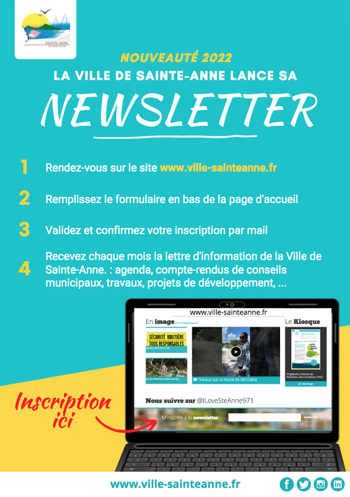 Janvier 2022Inscrivez-vous à la newsletter de la Ville de Sainte-Anne et recevez tous les mois, dans votre boite mail, l’essentiel de l’actualité de la commune : agenda et comptes-rendus des conseils municipaux, évènements culturels et sportifs à ne pas rater, travaux, projets de développement et d’aménagement du territoire, et autres infos pratiques…