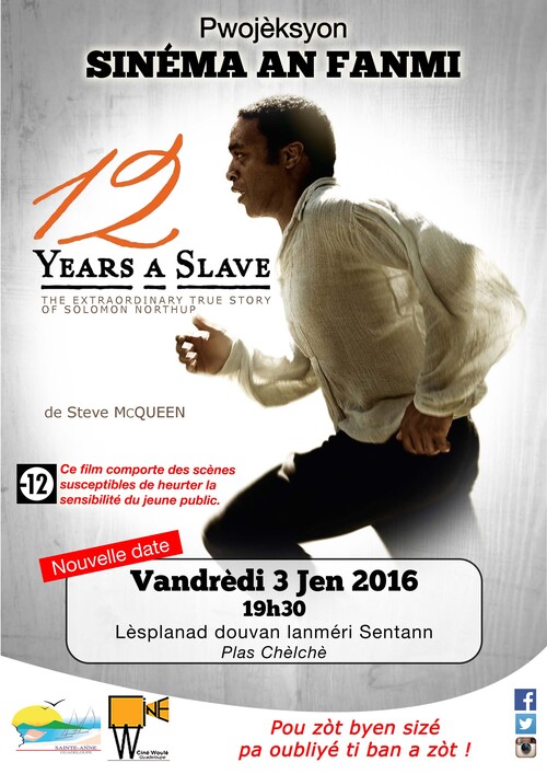 Dans le cadre de la commémoration de l’abolition de l’esclavage et de la manifestation "Sinéma an Fanmi", la Ville de Sainte-Anne en partenariat avec l’association Ciné-Woulé vous invite à la projection en plein air du film Twelve Years a Slave