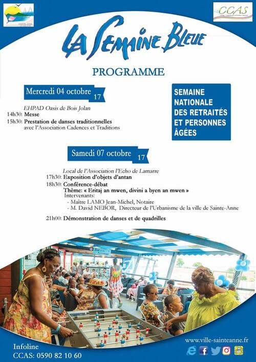 Durant le mois d’Octobre, la Ville de Sainte-Anne vous invite à participer à la manifestation « Octobre Bleu, Santé Rose ». Un mois d’initiatives pour inviter le grand public à prendre conscience de la place et du rôle des seniors dans la société et pour sensibiliser au cancer du sein, qui reste le plus fréquent et le plus meurtrier chez les femmes.