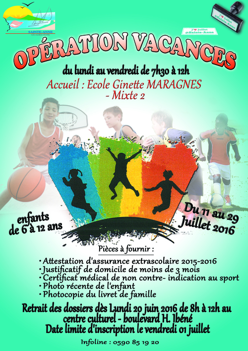 Christian BAPTISTE, maire de la ville de Sainte-Anne, informe ses administrés de la mise en place de l’ « Opération Vacances » qui se déroulera du 11au 29 juillet 2016.