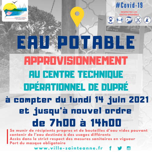 Juin 2021En raison des coupures d’eau prolongées sur le territoire, la Ville de Sainte-Anne informe ses administrés que le CTO (Centre Technique Opérationnel) de Dupré sera accessible pour un approvisionnement en eau potable à compter du lundi 14 juin 2021 et ce jusqu’à nouvel ordre, de 7h à 14h.