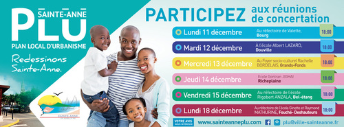 Dans le cadre de la phase finale de l’élaboration du Plan Local d’Urbanisme de la Ville de Sainte-Anne, le Maire Christian Baptiste et son équipe organisent une nouvelle session de réunions de concertation afin de présenter :