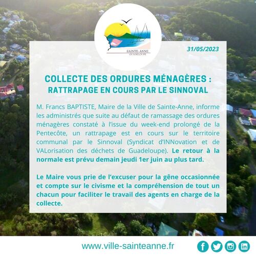M. Francs BAPTISTE, Maire de la Ville de Sainte-Anne, informe les administrés que suite au défaut de ramassage des ordures ménagères constaté à l’issue du week-end prolongé de la Pentecôte, un rattrapage est en cours sur le territoire communal par le Sinnoval (Syndicat d’INNovation et de VALorisation des déchets de Guadeloupe).